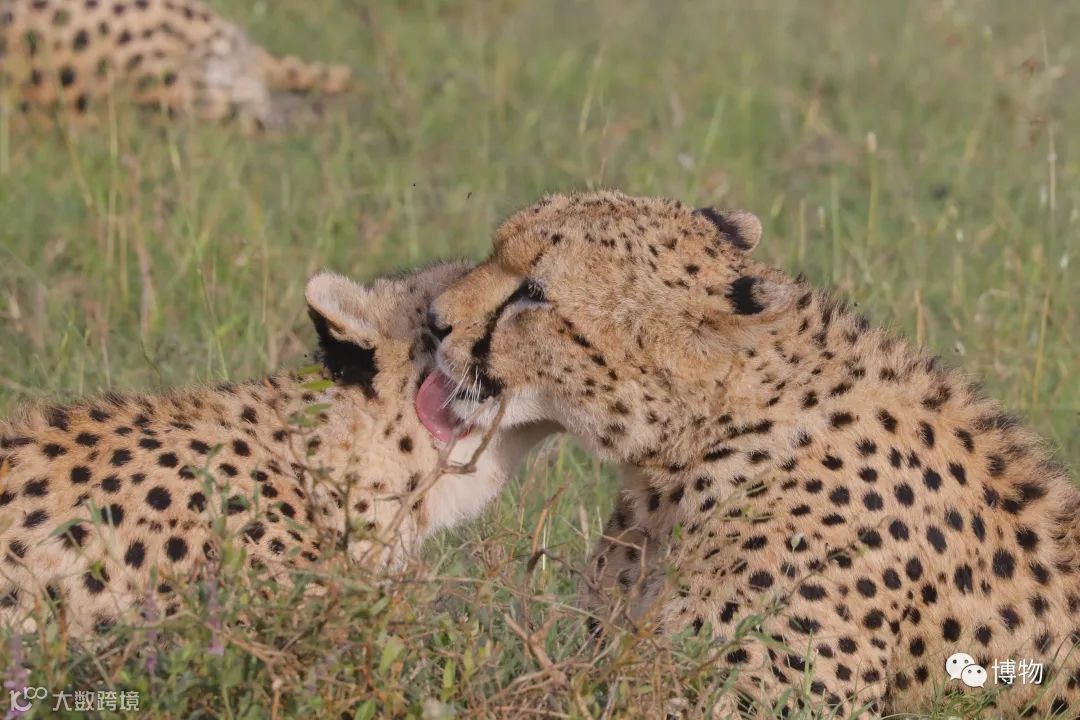 而对于那些还没有单独活动的猎豹来说,相互舔毛、舔脸就是兄弟姐妹间增强关系的方式。