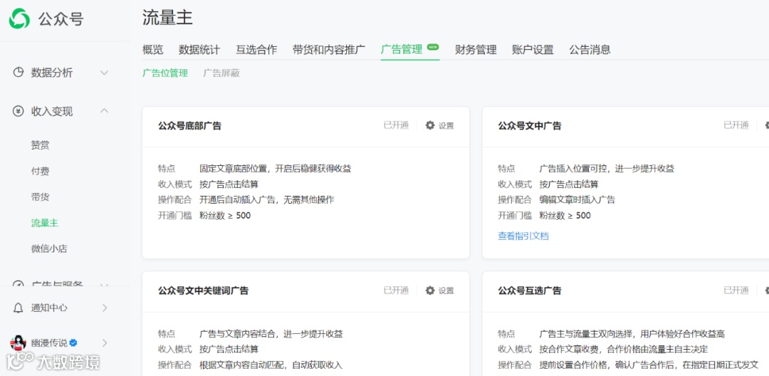 公众号官方流量主/广告主:零风险、结算稳定,是所有变现方式的“基础盘”,适合所有运营者;