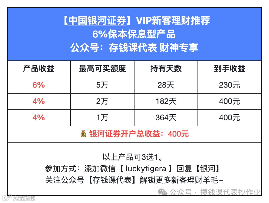 如果大家对上面任何一家券商的新客理财感兴趣,都可以直接添加课代表的微信:luckytigera ,备注您要参加的券商名称。