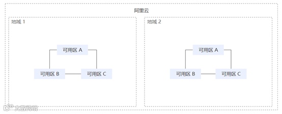 阿里云的地域由1到12个物理分隔的数据中心组成,每个数据中心都有自己独特的电力、冷却和网络基础设施。这些数据中心被阿里云称为区域(Zones),而其他云服务提供商通常称之为可用区,两者意思基本等同(Availability Zones)。为了说明这一点,下图中地域1包含三个可用区(可用区A,可用区B,可用区C),地域2也包含三个可用区: