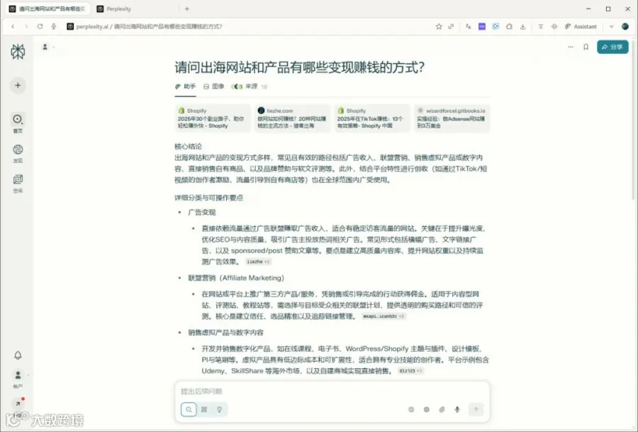出海网站有哪些变现方式?刚安装好Comet,我们正好可以通过Comet测试Perplexity怎样回答这个问题。