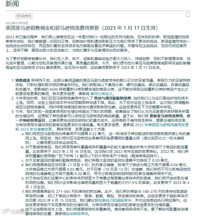 根据亚马逊在11月发布的一份公告显示,为了有效使用仓储空间的卖家提供更多的仓储容量,将于2023年1月17日起调整亚马逊美国站物流配送费用。