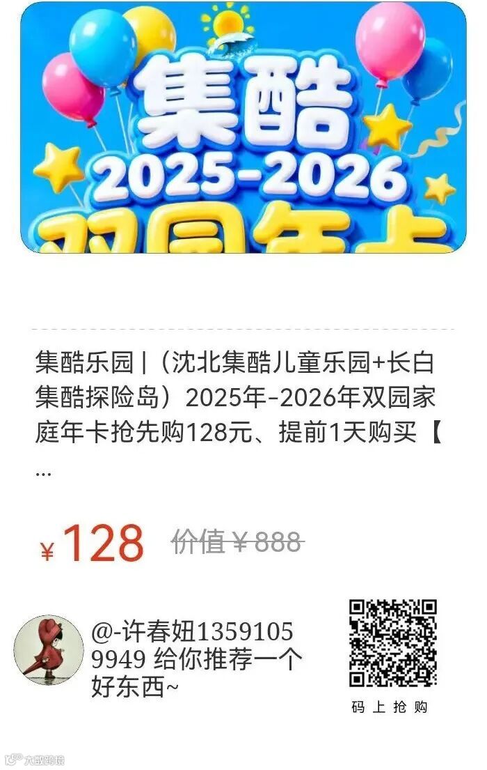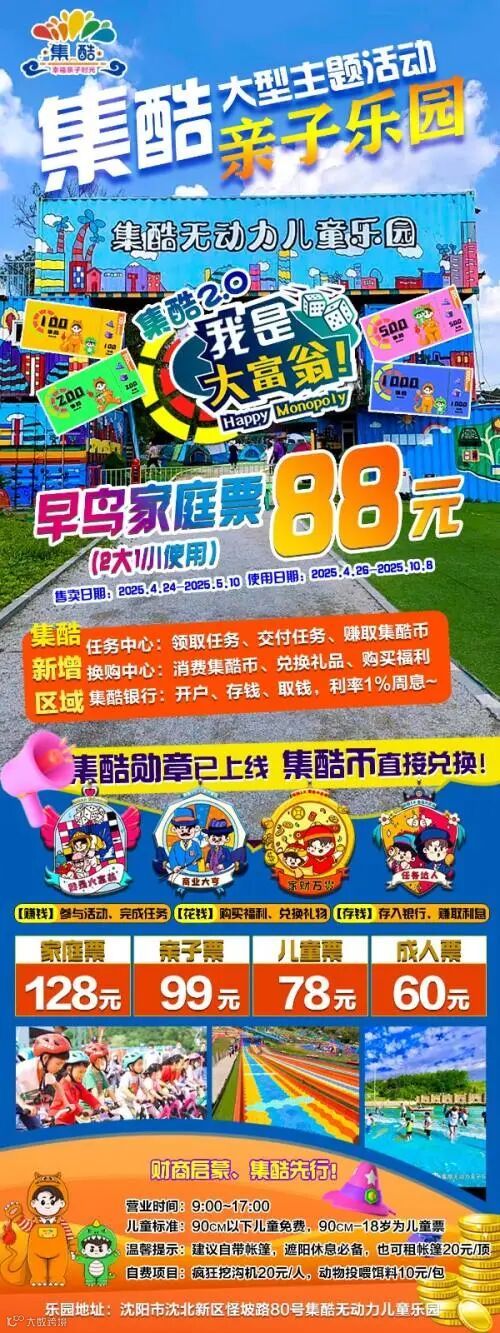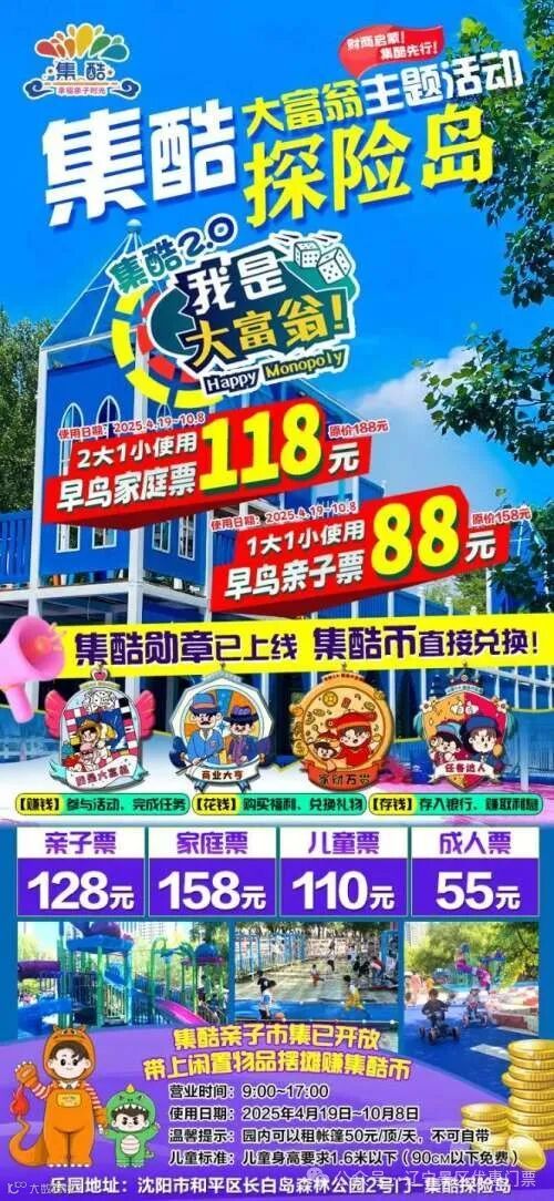 一、集酷乐园 |(沈北集酷儿童乐园+长白集酷探险岛)2025年-2026年双园家庭年卡抢先购128元、提前1天购买【电子票】(特价票不退不改)