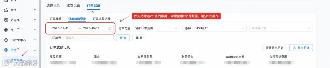 答:您可以前往【跨境卖家中心-资金-资金管理-订单放款记录】查询您在平台内经营相关数据