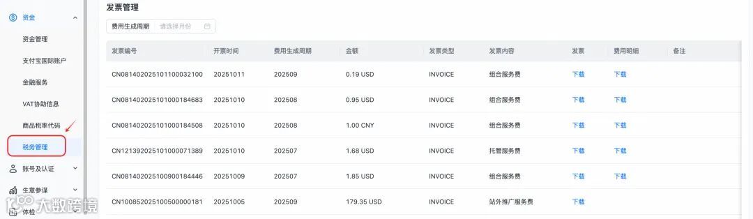 答:入口为商家工作台-资金-税务管理(点此快速进入),一般在次月7号后由系统自动开具,开票成功后即可下载。目前仅包含非俄语区国家在直通车推广、类目佣金、营销佣金、托管物流等支出费用。罚款、环保费暂不包含在本期内,敬请期待后续产品功能迭代