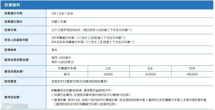 2.预缴全期保费,享最高 5% 优惠利率(年缴 5 万美元以上,利率 5%);