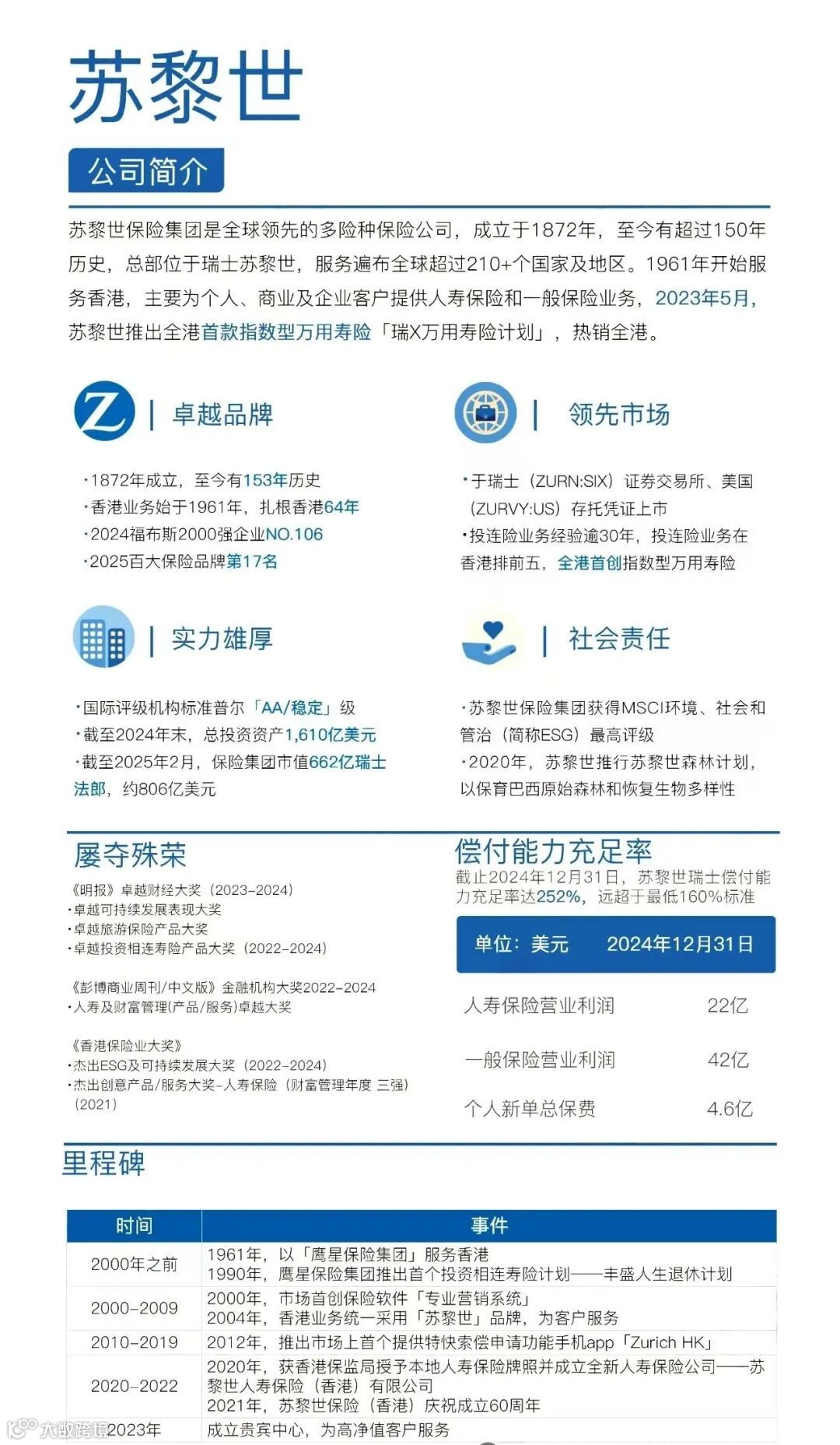 •全球巨头:全球十大寿险公司之一,福布斯全球 2000 强(2024 年排第 106 名),成立 153 年,总部在瑞士,服务覆盖 210 多个国家和地区;