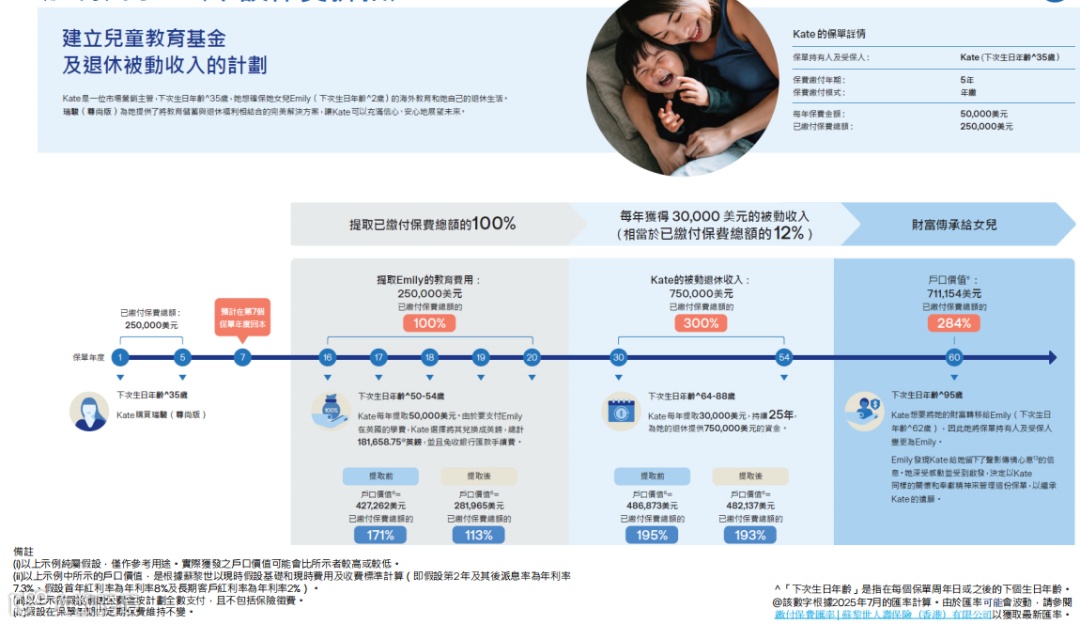 举个真实场景:35 岁的 Kate 选了 5 年缴,每年缴 5 万美元,总保费 250 万美元。她用这笔钱给 2 岁女儿存教育金,还规划自己的退休: