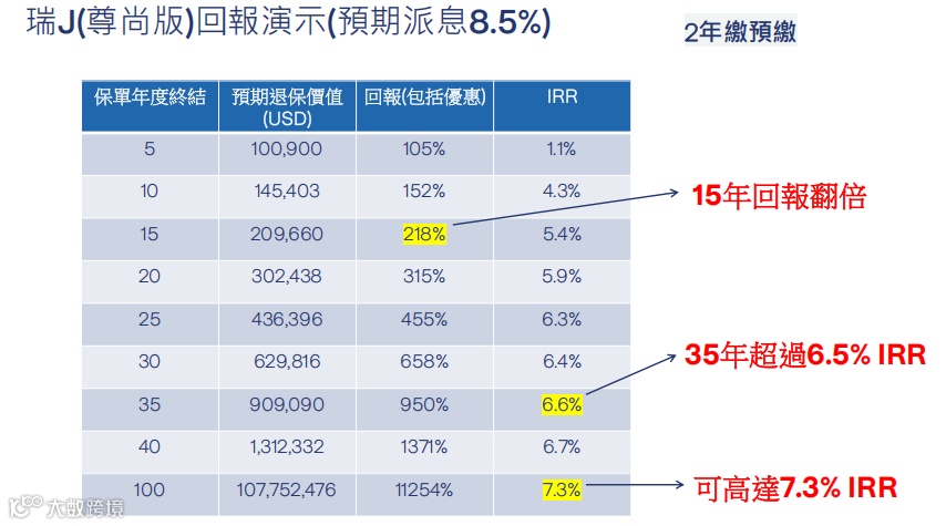 按 8.5% 派息率测算,减去各种费用后,15 年回报能翻倍,35 年 IRR(内部收益率)超过 6.5%,长期能到 7.3%,比传统储蓄险的“天花板” 高不少。