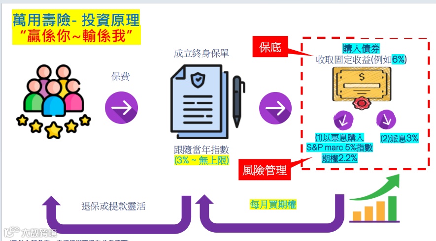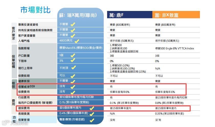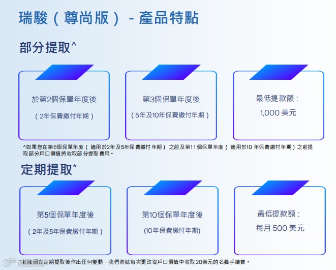 •最低提款额 1000 美元,5 年内提款需要收少量退保费,但剩下的资金还能继续 “跟涨市场 + 拿基础派息”;
