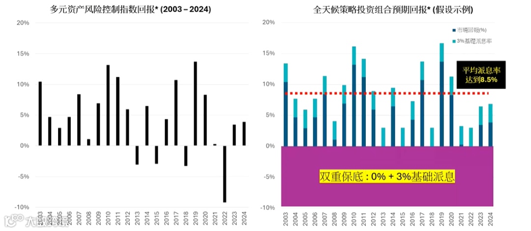 •第二层:额外 3% 基础派息率。在 0% 之上,再给 3% 的基础派息,哪怕市场回报是 - 10%,派息率也有 0%+3%=3%;