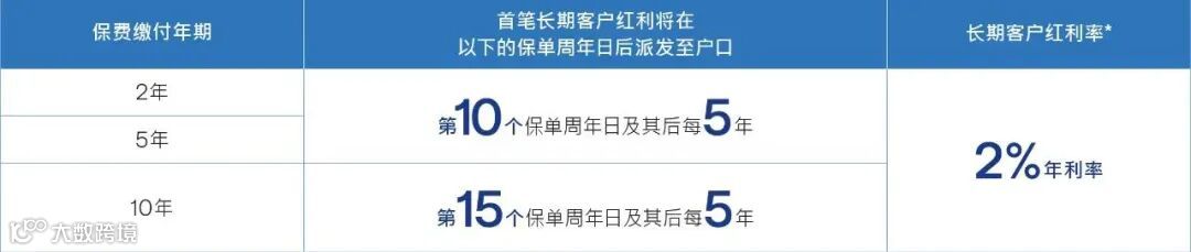 •长期福利:资金长期不提取,第 10/15 个保单周年后,每 5 年还能额外加 2% 长期客户红利(比如 5 年缴,平时派息 8%,到了第 10、15 周年,派息率就变成 10%)。