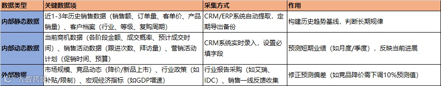 预测不能只依赖“历史销售数据”,需整合“内部+外部”“静态+动态”全维度数据,构建完整的数据支撑体系: