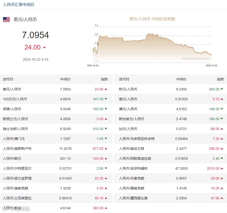 2025年10月22日:人民币兑美元汇率中间价7.0954,离岸开盘价7.1258,在岸开盘价7.1200