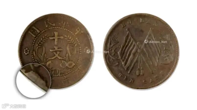 藏品详情:这枚错版币堪称“民国造币失误的活化石”,正面双旗交叉角度比正常版少15度,左侧旗帜边缘有0.5mm的“溢铜”痕迹;背面嘉禾纹呈逆时针环绕,且“十文”字样下方多刻一道细横线,属于典型的“模具位移+刻模失误”双重错版。经NGC评级为AU58,币面虽有轻微流通痕迹,但错版特征完整清晰,无后期修补痕迹。据考证,该币铸造于1916年河南造币厂,因当时设备老旧、工匠操作失误产生,存世量不足5枚,此前仅在2019年出现过1枚同类型错版币,当时成交价为156万元。