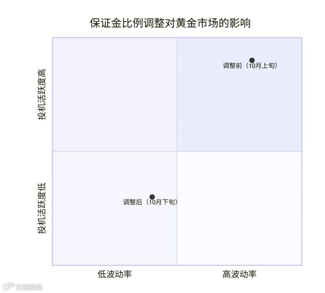 上海期货交易所在2025年10月21日将黄金期货保证金比例从**10%上调至16%,同时涨跌停板幅度扩大至14%**。以下示意图展示了政策调整前后市场的对比情况: