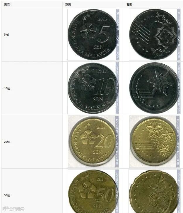 货币有5、10、20、50分,1令吉等于100仙(cents)