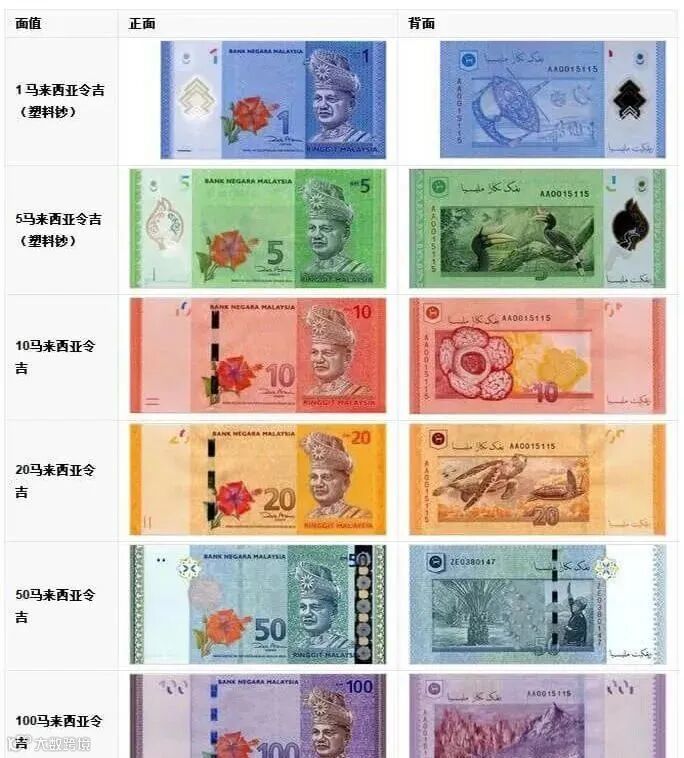 马来西亚常用纸币有RM1, RM5, RM10, RM20, RM50, RM100这几种面值。