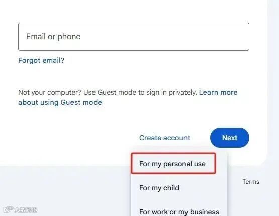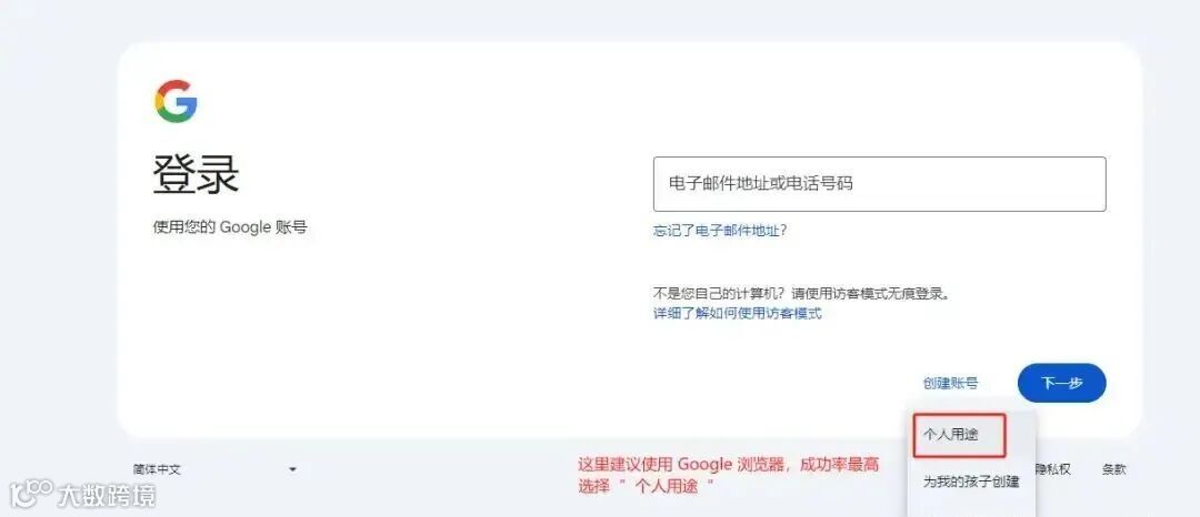 步骤一:打开 Google 浏览器主页,点击右上角”登录“,选择”创建账号“——”个人用途“,点击下一步。