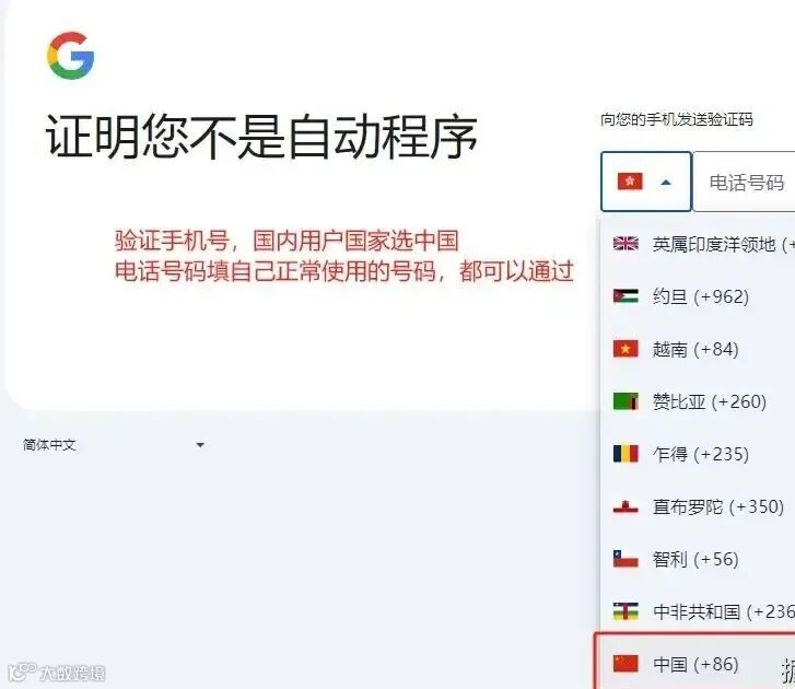 步骤四:验证手机号。这是谷歌的机器人识别程序,国内用户国家往下滑选中国。号码就填自己的手机号,一个手机号是可以注册多个 Gmail 账号的。