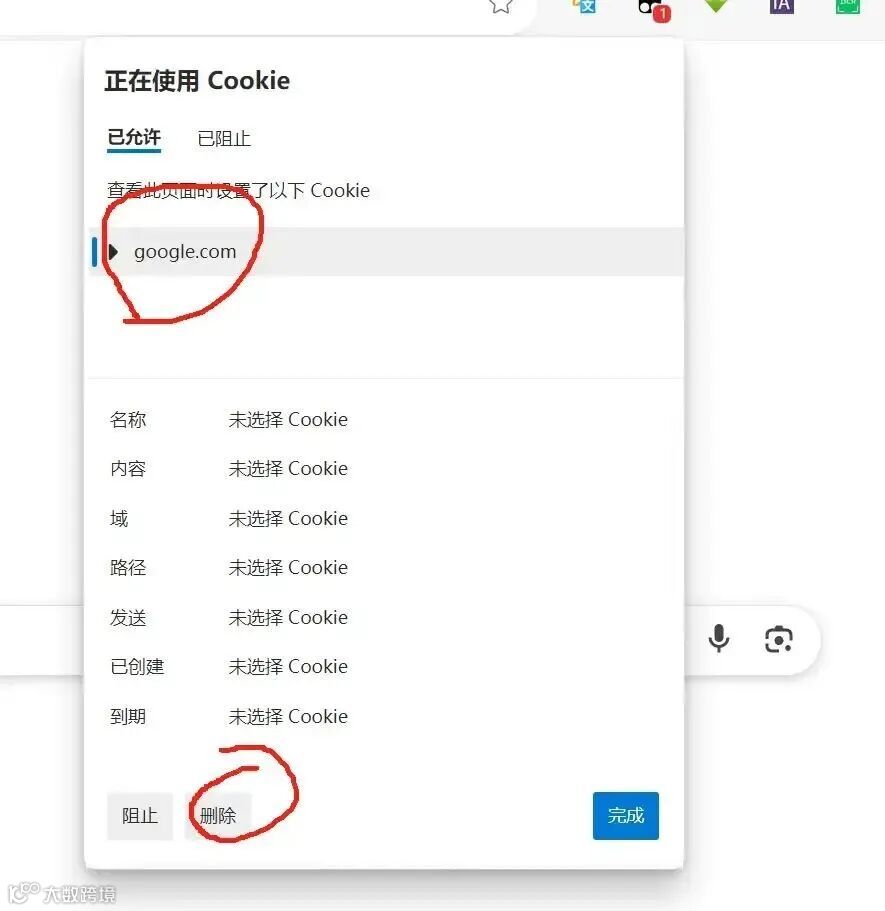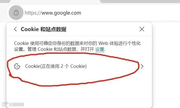 使用Microsoft Edge 浏览器,打开www.google.com,点击网站边上的小锁,选择COOKIE和站点数据,删除Cookie→google.com