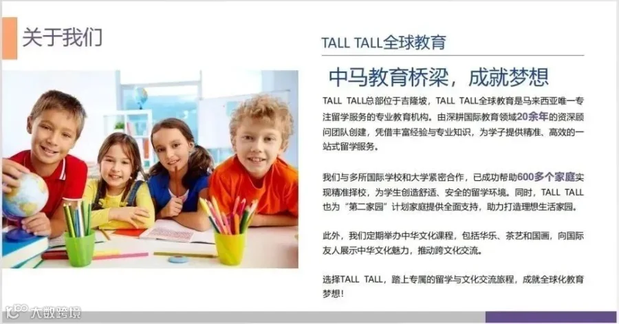 选择 TALL TALL 全球教育,让20年国际教育经验为孩子的留学之路保驾护航,踏上专属的留学与文化交流旅程,成就全球化教育梦想!
