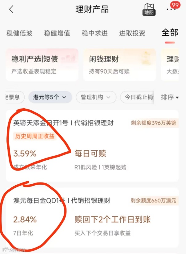 据我观察,美元理财产品应该是近一两年国内银行才陆续上架的,有个别银行还有其他币种的理财,比如今天写这篇文章搜索的时候发现,招商银行还有英镑和澳元活期理财,收益率也还不错: