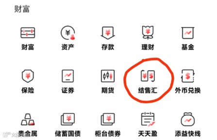 接下来,打开你的银行APP首页,点开“全部”或者“更多”,找到“购汇”或者“结售汇”,通常被归类到跨境金融或者财富板块,下面是我随便找了不同银行的截图: