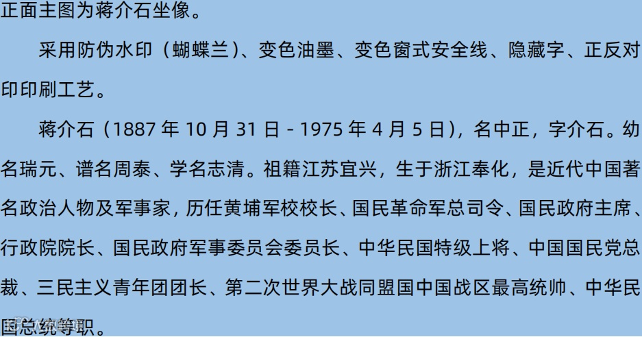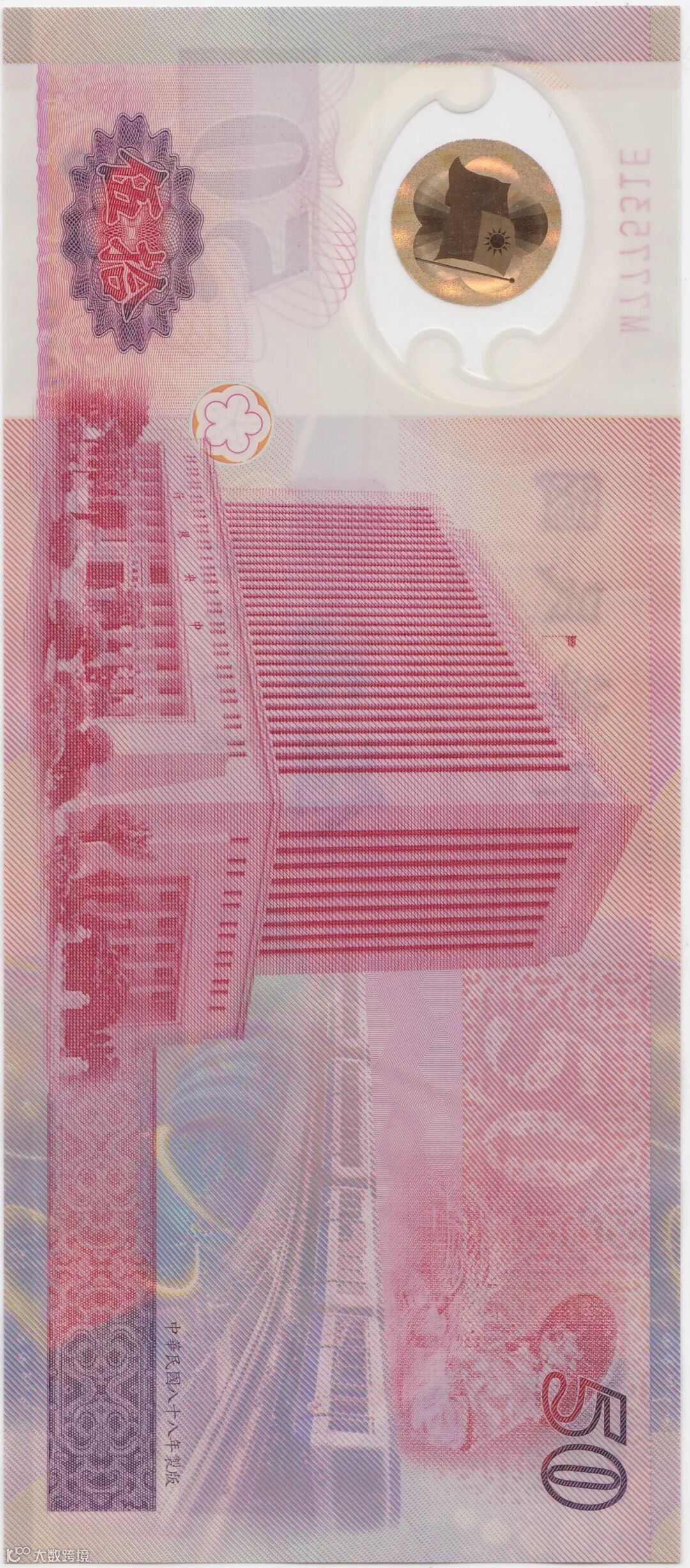 正面图案为1949年发行的1圆新台币和1999年发行的100圆新台币;背景为铁路桥、公路立交桥、子弹头火车、空间技术等。