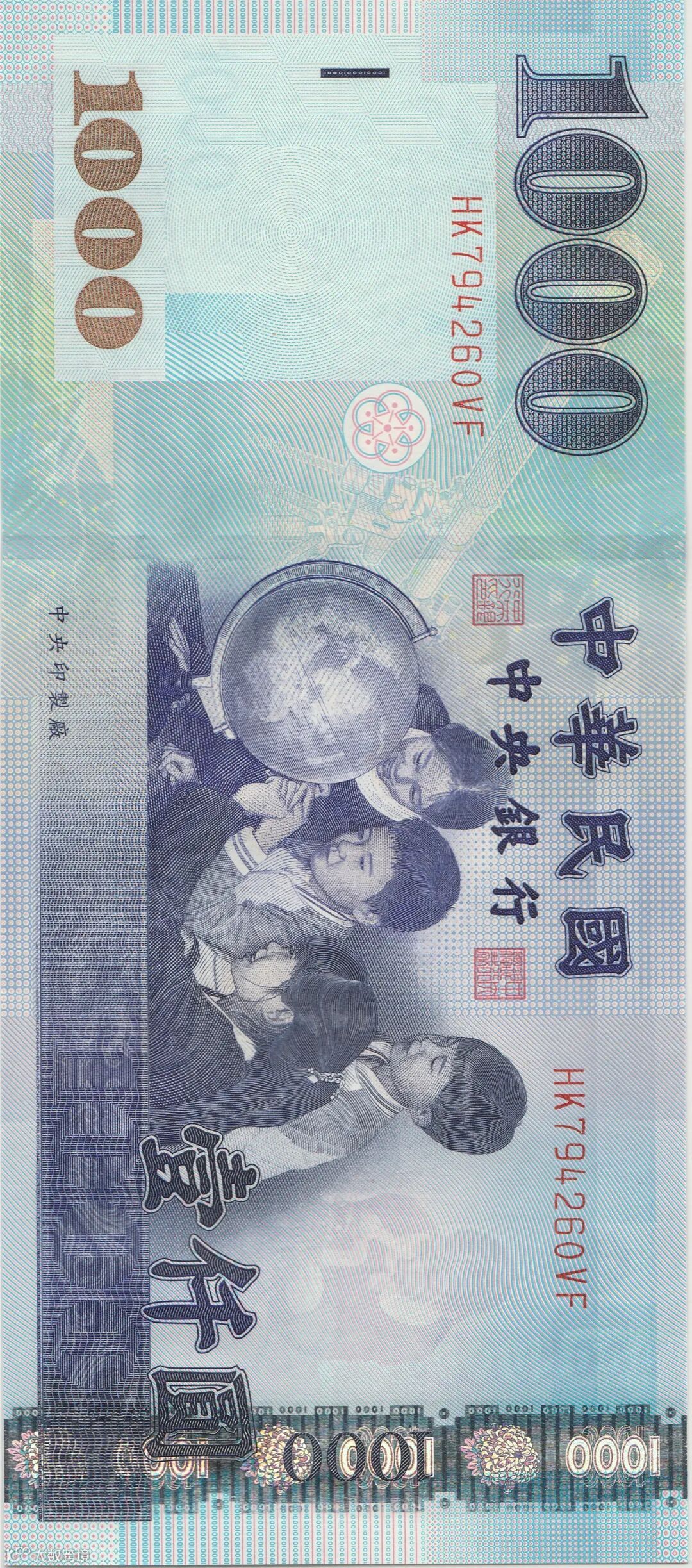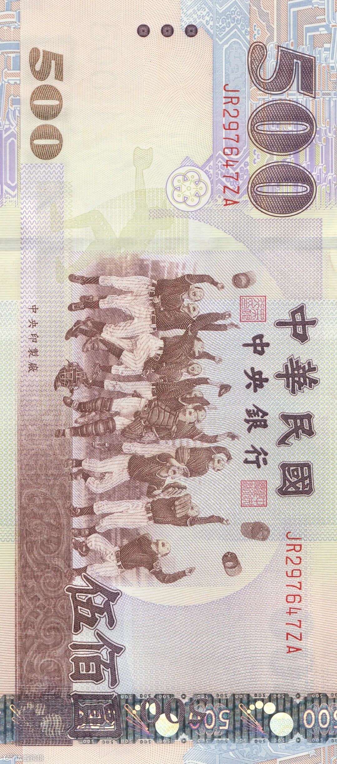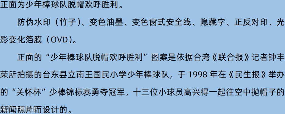 背面图案为台湾“中央银行”大楼、旅客列车、收获稻谷等。