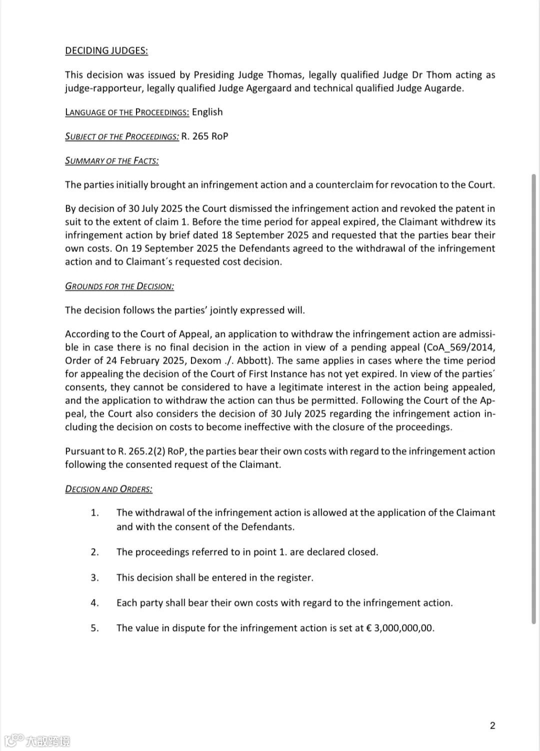 尤其值得注意的是,法院强调:随着撤诉获准,此前于2025年7月30日作出的关于侵权和费用的判决亦随之失效。这意味着,该案并未形成具有既判力的终局判决,从而为双方未来可能的技术合作或再许可谈判保留了空间。