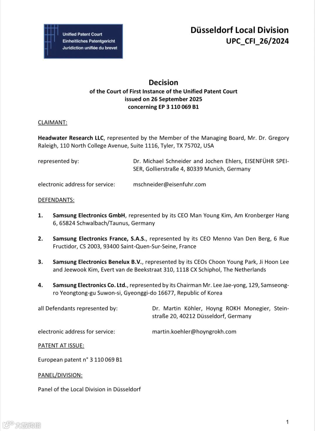 2025年9月26日,欧洲专利界迎来一则重磅消息:在德国杜塞尔多夫地方法院,统一专利法院(Unified Patent Court, UPC)就美国科技公司Headwater Research LLC诉三星电子(Samsung Electronics)专利侵权案(案号:UPC_CFI_26/2024)作出最终裁定——原告Headwater Research主动撤回侵权诉讼,被告三星四家实体公司表示同意,法院据此宣布程序终结,案件正式落幕。