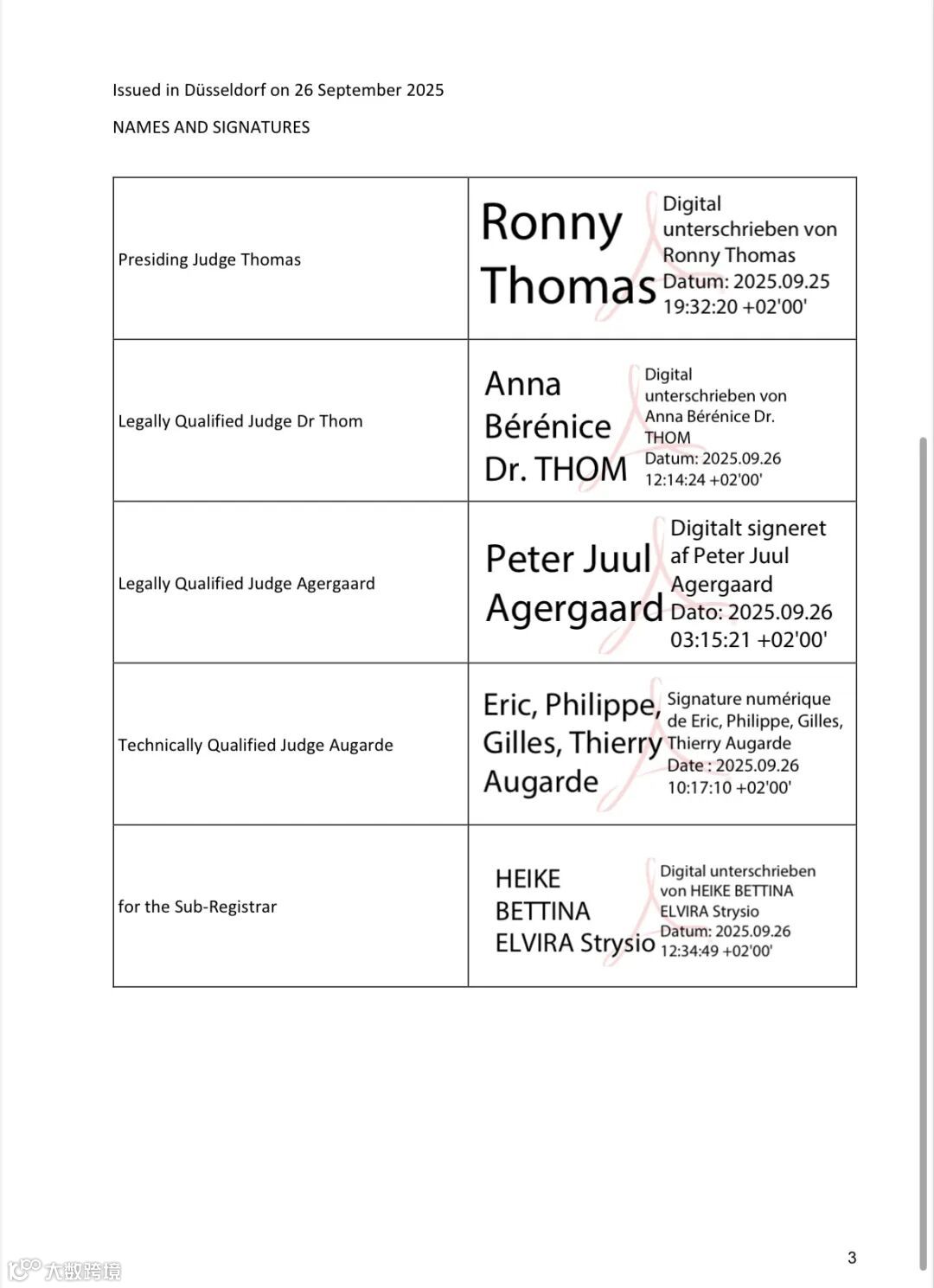 2025年9月26日,杜塞尔多夫地方法院正式发布最终决定。由托马斯法官(Presiding Judge Thomas)领衔,托姆博士(Dr. Thom)、阿盖尔法官(Agergaard)和技术法官奥加德(Augarde)组成的合议庭,作出如下裁定:
