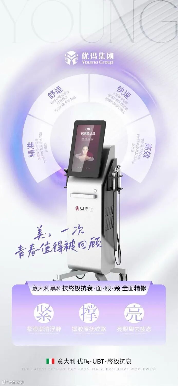 优玛UBT抗衰终点站一台仪器就融合2项国际顶尖技术:超速波技术(USC),碳纳米热浪聚焦技术(NRG),负离子修复技术结合,唤醒肌肤活性,加速面部循环,尤其是穿透真皮层的抗衰,效果更为显著。