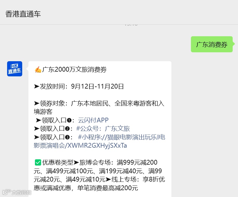 在公众号#香港直通车 回复【广东消费券】还能领取广东省文旅消费券