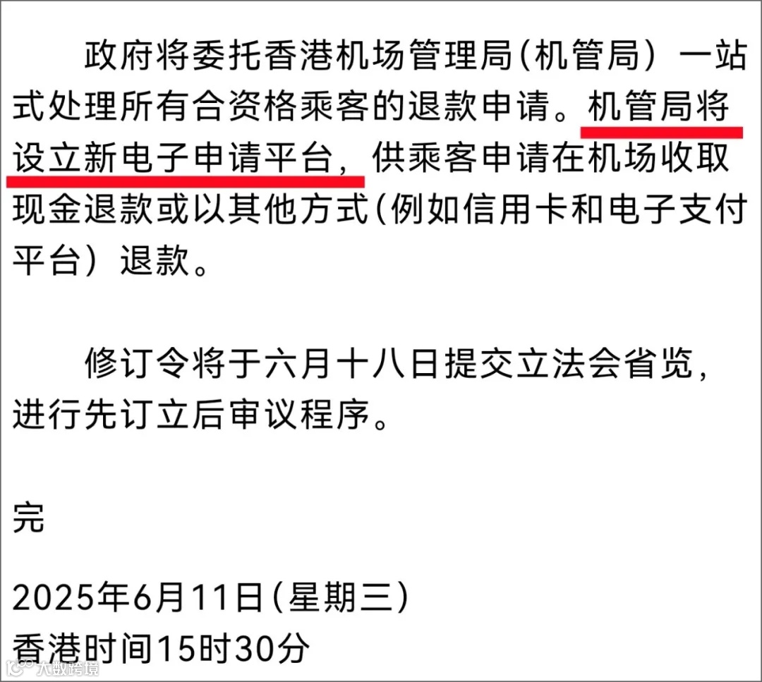 公告还提到香港机场管理局将设立新电子申请平台,供乘客申请在机场收取现金退款或以其他方式(例如信用卡和电子支付平台)退款。