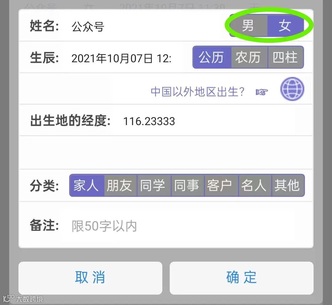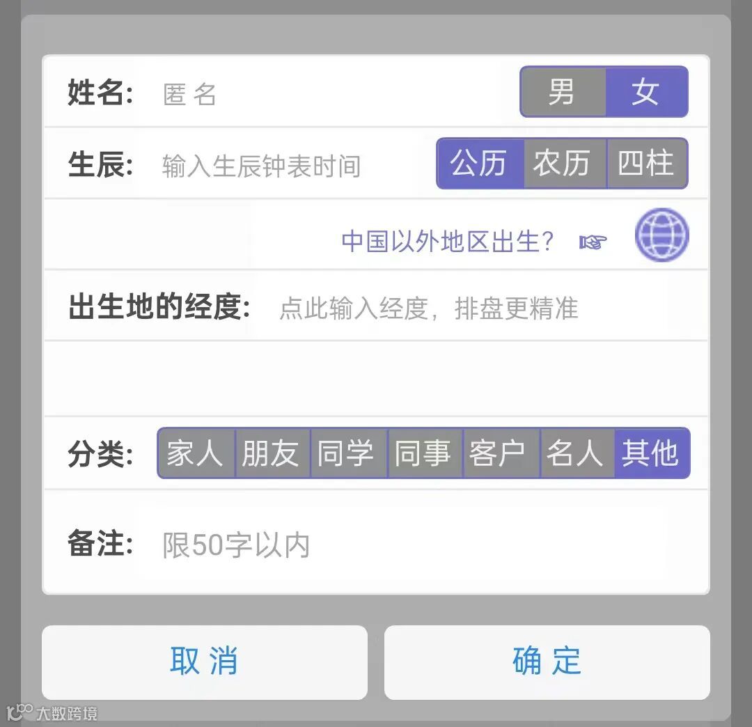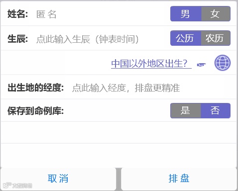 (ps:若您是出生在国外。也可以用其他查询经纬度的网站,查寻下出生地的经纬度。查询后记下,再回到界面点击白色字体,在弹出的界面中填写具体数值即可)