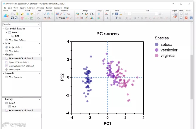 局部整体表(Partsof whole)、多变量表(Multiplevariables)及嵌套表(Nested)这3种数据表及其所支持的图形绘制,尤其是GraphPadPrism 9 新增的主成分分析和气泡图。