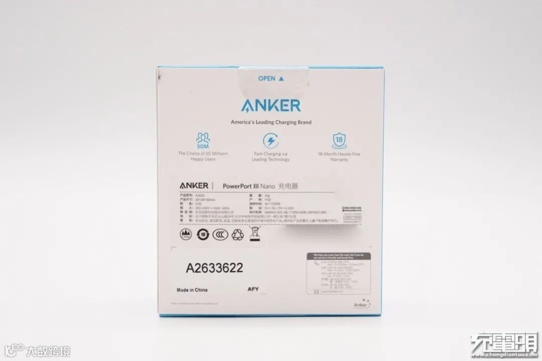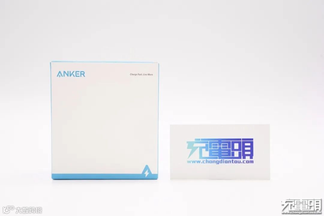 产品沿用Anker安克典型蓝白配色包装盒,正面印有Anker品牌和闪电logo。