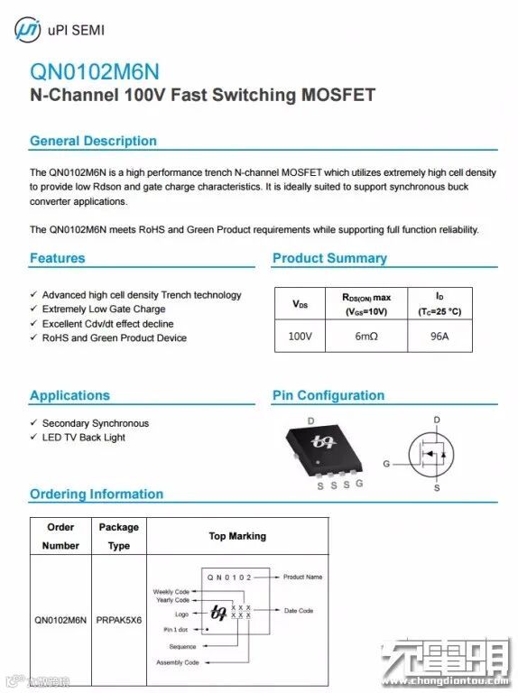 UBIQ QN0102M6N次级同步整流管,NMOS,耐压100V,导阻6mΩ。