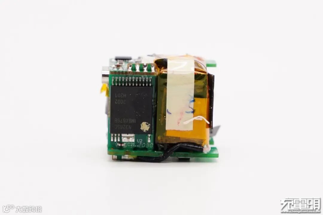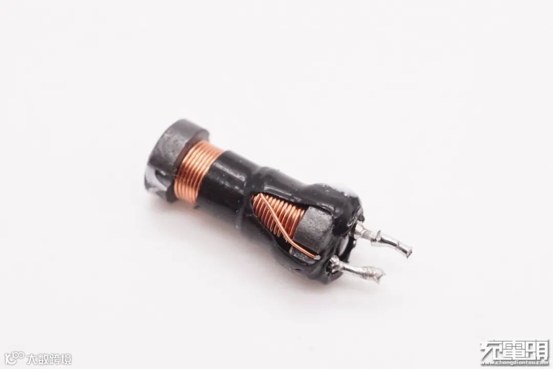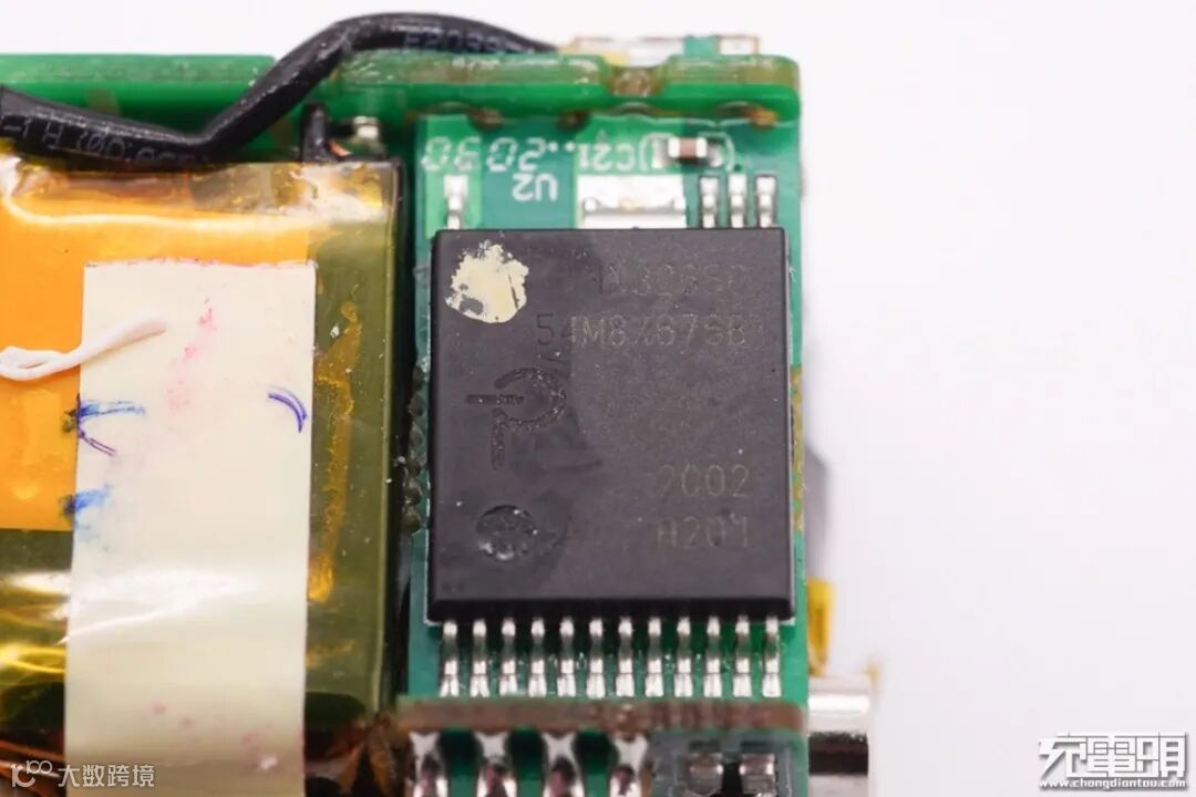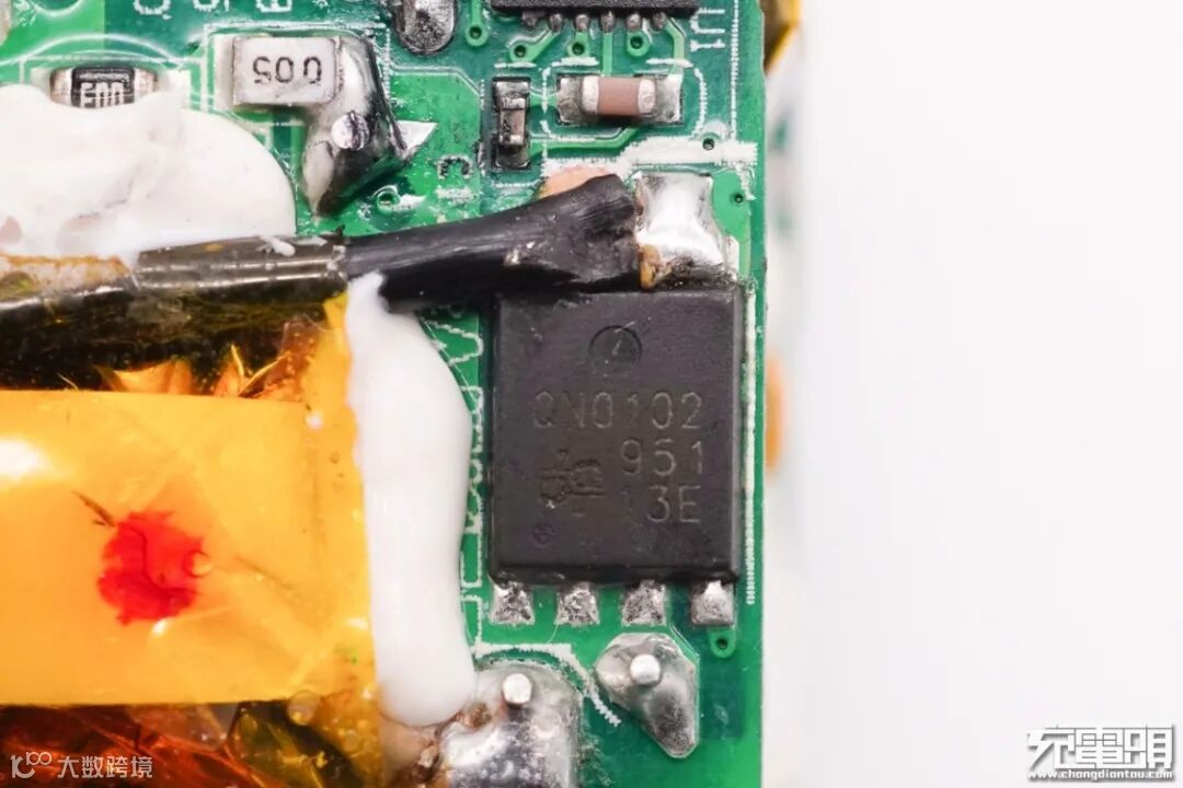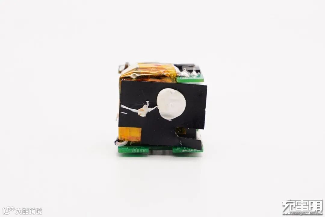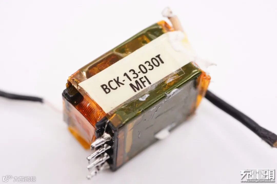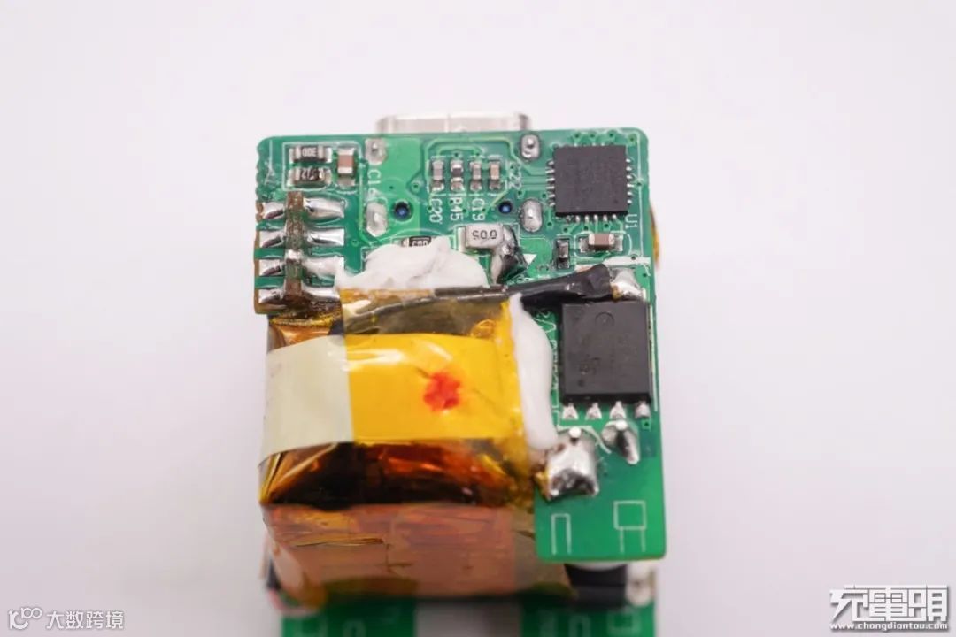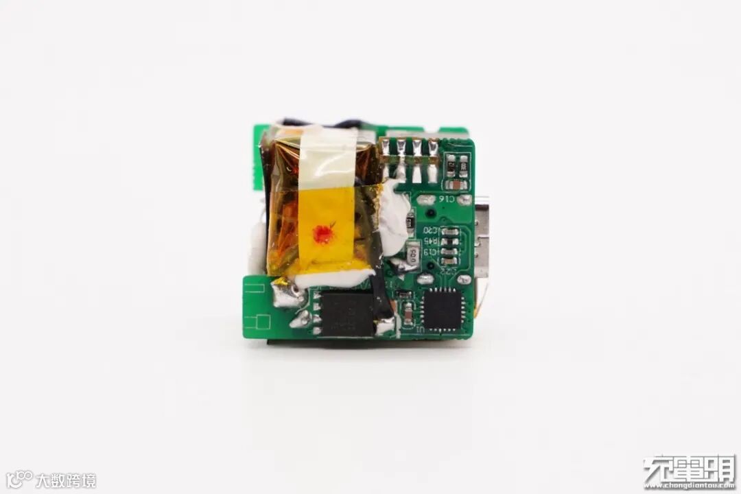 连接初次级的小板上设有充电器主控芯片,右侧安置变压器。