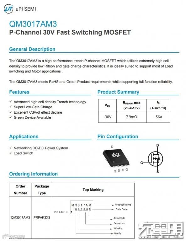 USB-C口输出VBUS开关管采用UBIQ QM3017AM3,PMOS,耐压30V。
