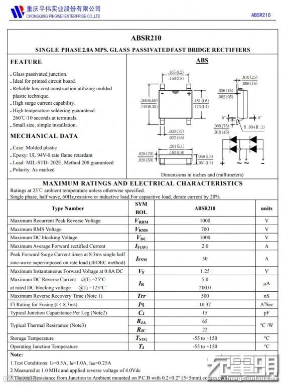 重庆平伟 ABSR210整流桥特写,电流2A,反向耐压1000V。