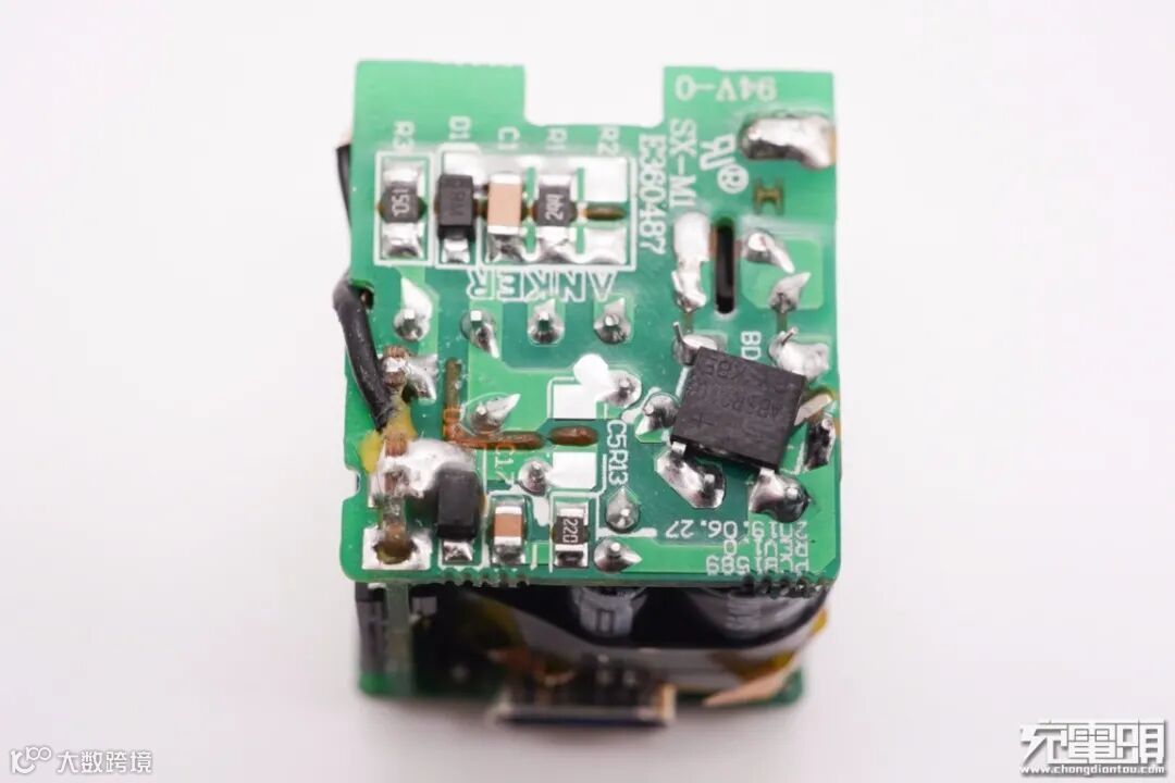 此外充电器采用了类似“夹心饼干”结构设计,输入输出小板之间布局电解电容和变压器等元器件,元件之间打胶固定,不仅有效压缩充电器体积,内部也更加稳固。电容和变压器使用绝缘管和胶带包裹进行保护。在高集成度快充方案以及巧妙设计的结合下,造就了Anker安克 Nano 20W PD充电器的超小机身。