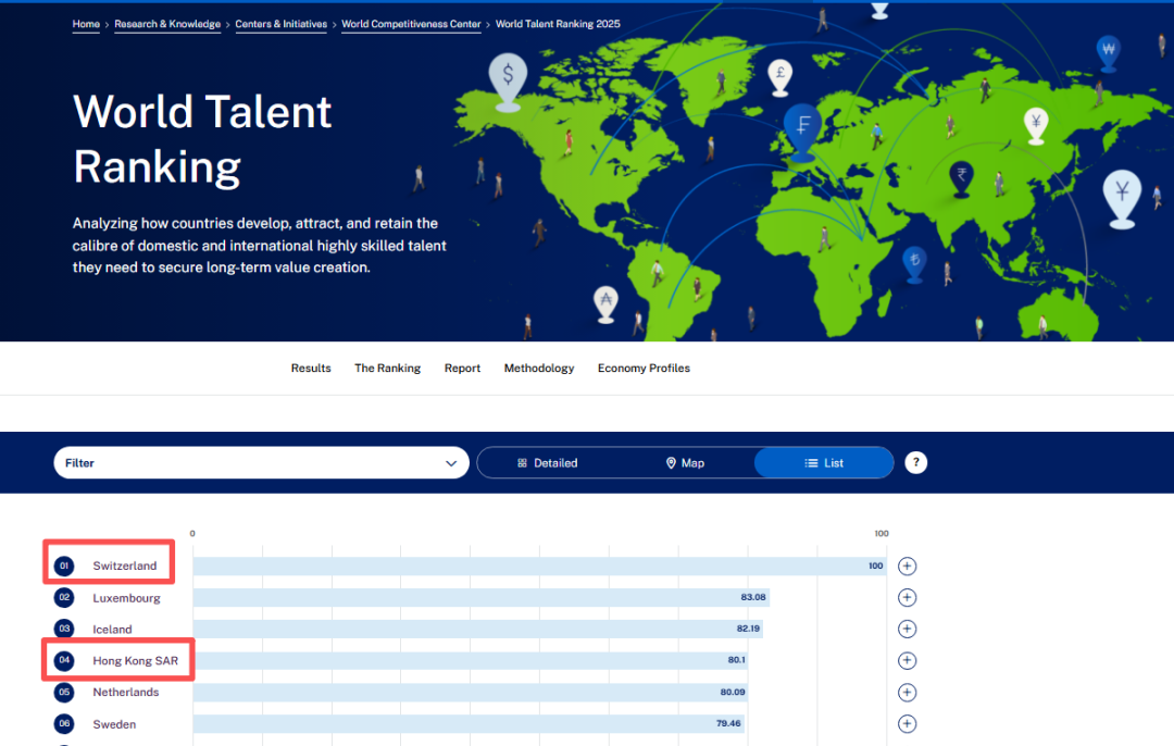瑞士洛桑国际管理发展学院(IMD)9月发布的《2025年世界人才排名》报告显示,香港从去年的全球第九位跃升至第四位,创下历来最高排名,荣登亚洲之冠。