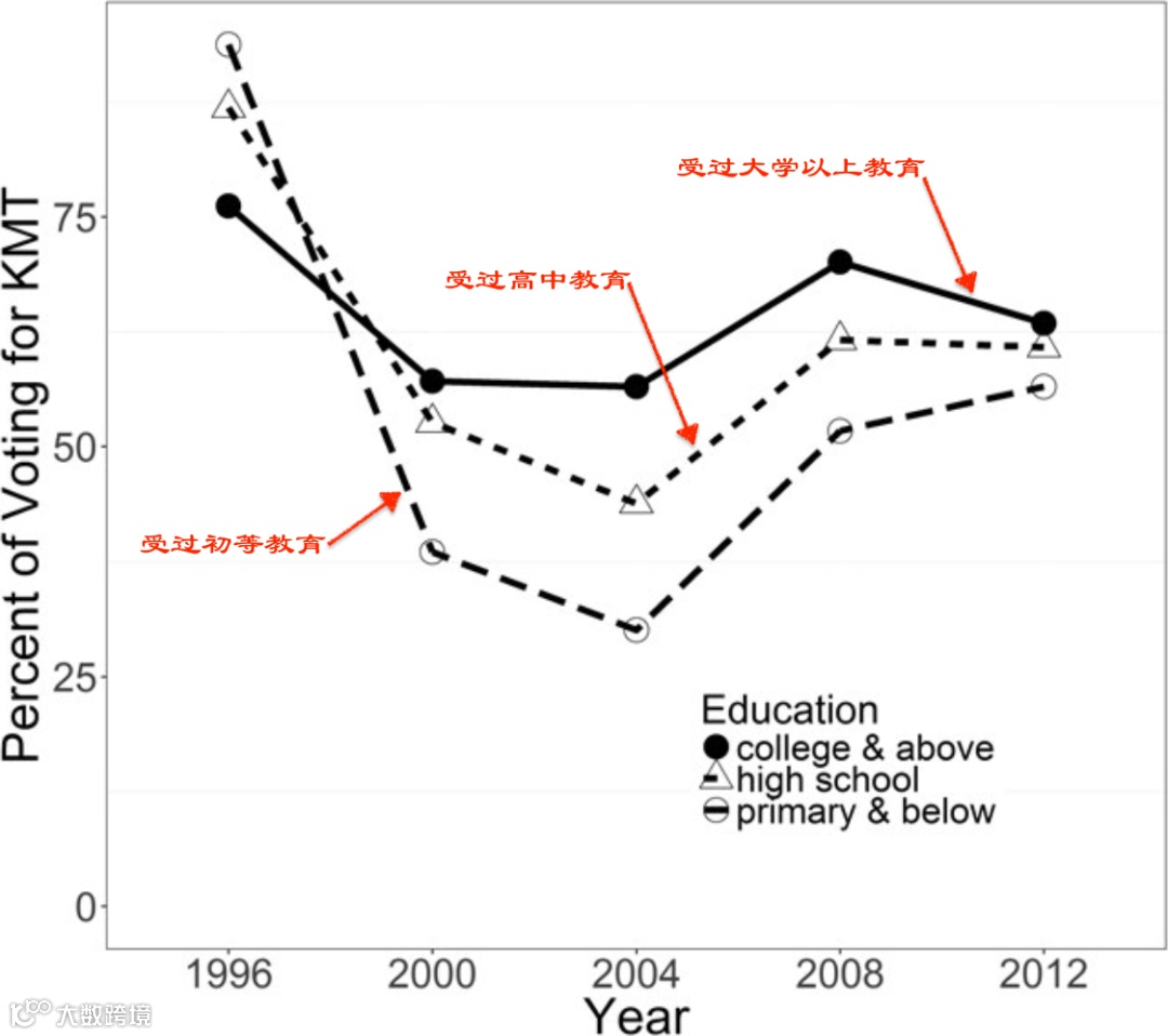 说明:1996年到2012年台湾不同受教育水平群体对国民党的支持率.