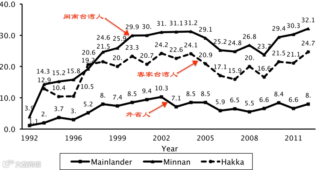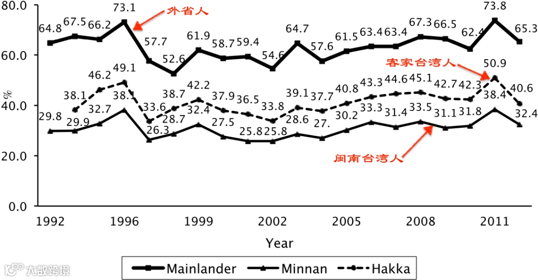 说明:1992年到2012年台湾不同族群对民进党忠诚度的变化.