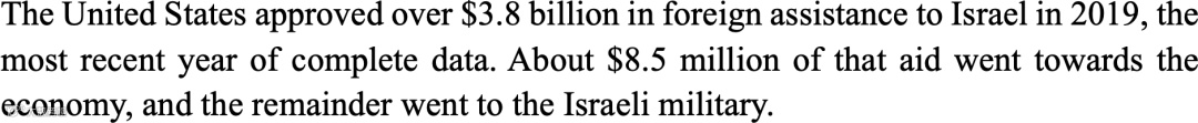 相比于以色列,美国对台湾省的军事援助也不少。2019年,美国共计援助以色列38亿美元,其中只有850万美元被用于改善以色列经济状况,其余资金全部用于军事援助。
