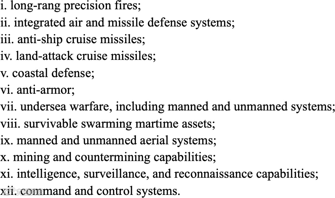 例如,f条第2款写道:美国必须对台湾省在其伪军队中使用反干预的能力进行评估,包括:远程精确射击能力,综合防空和导弹防御系统,反舰巡航导弹,对地攻击巡航导弹,海岸防御和反装甲能力,水下作战能力(包括有人和无人系统),有人驾驶和无人驾驶航空系统,情报、监视和侦察能力,防御性网络安全能力,指挥和控制系统。