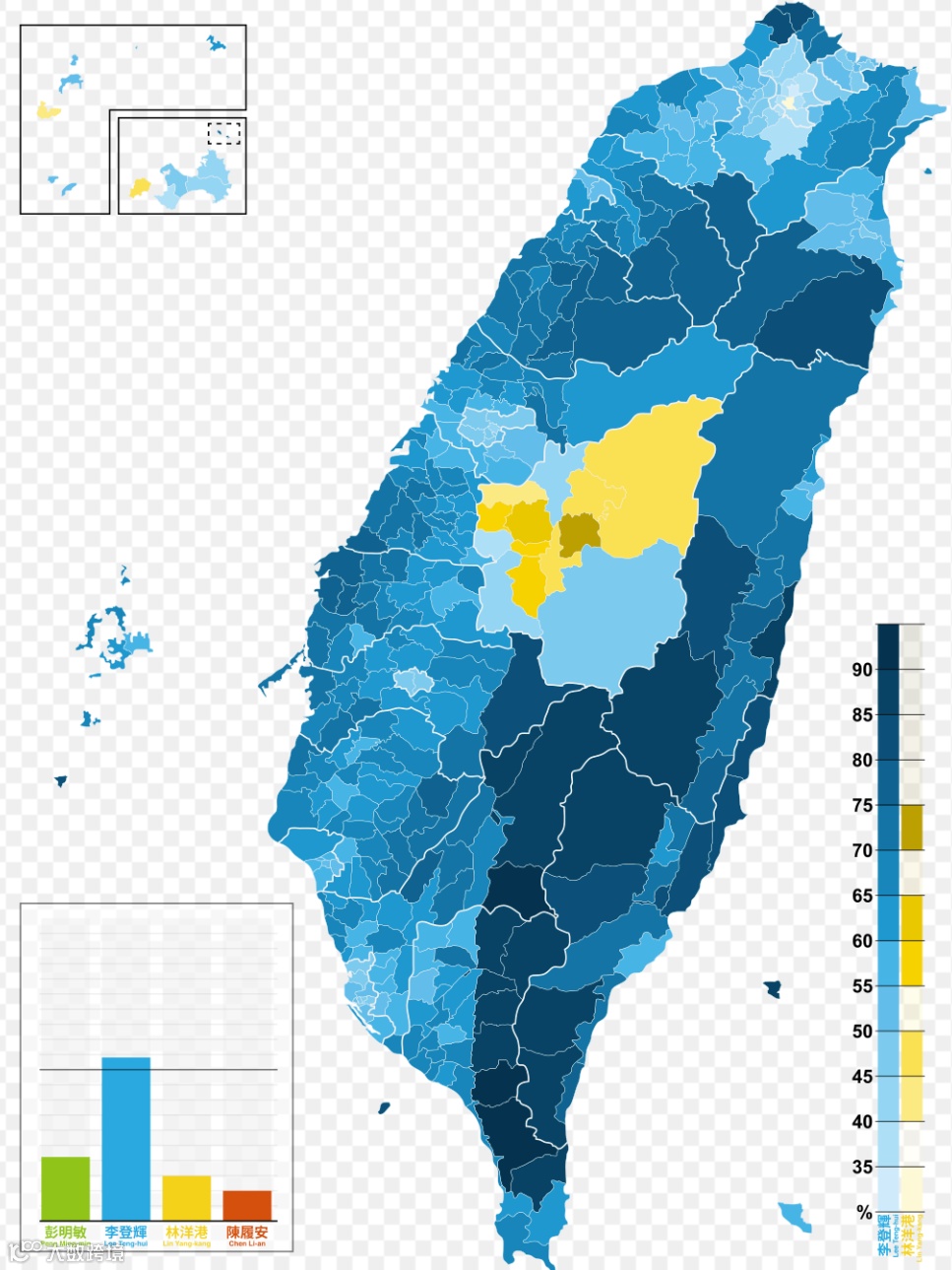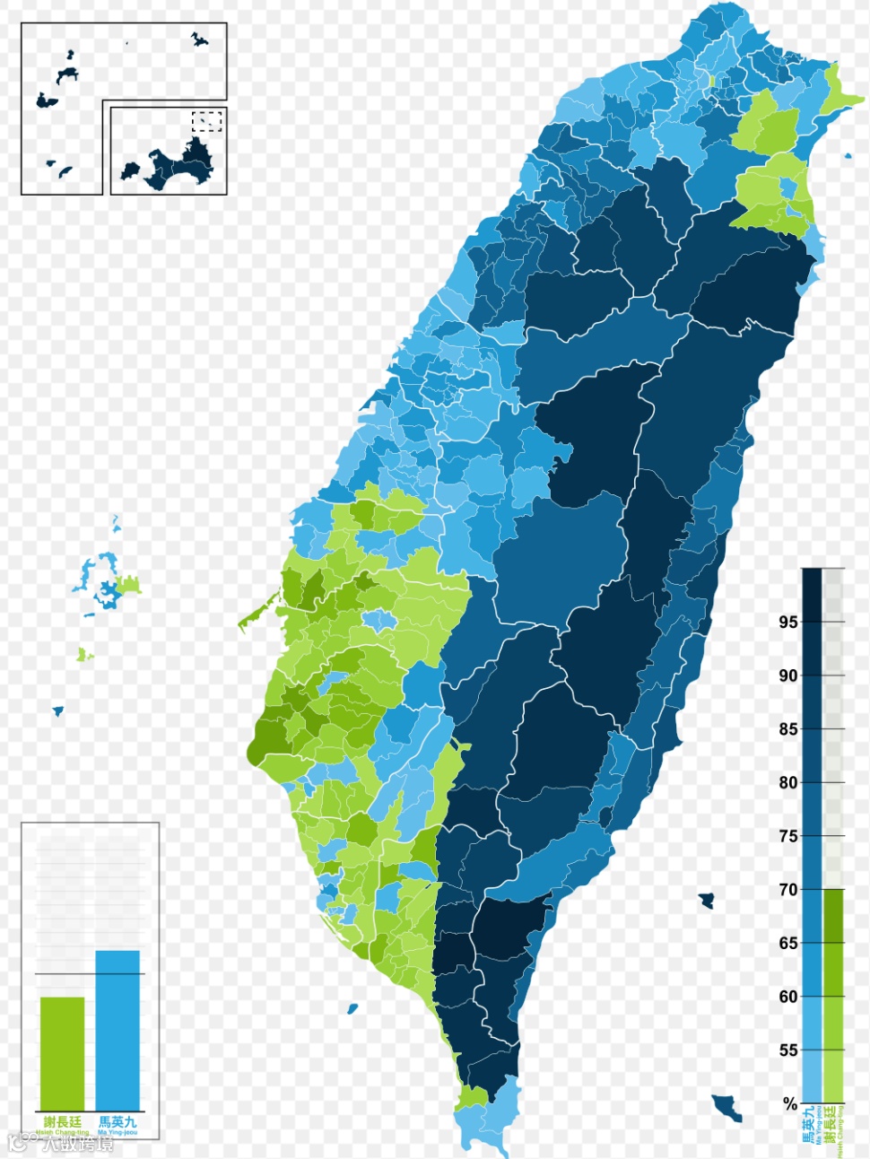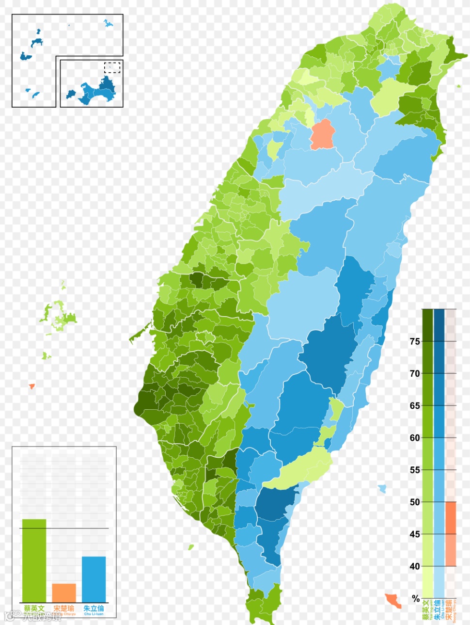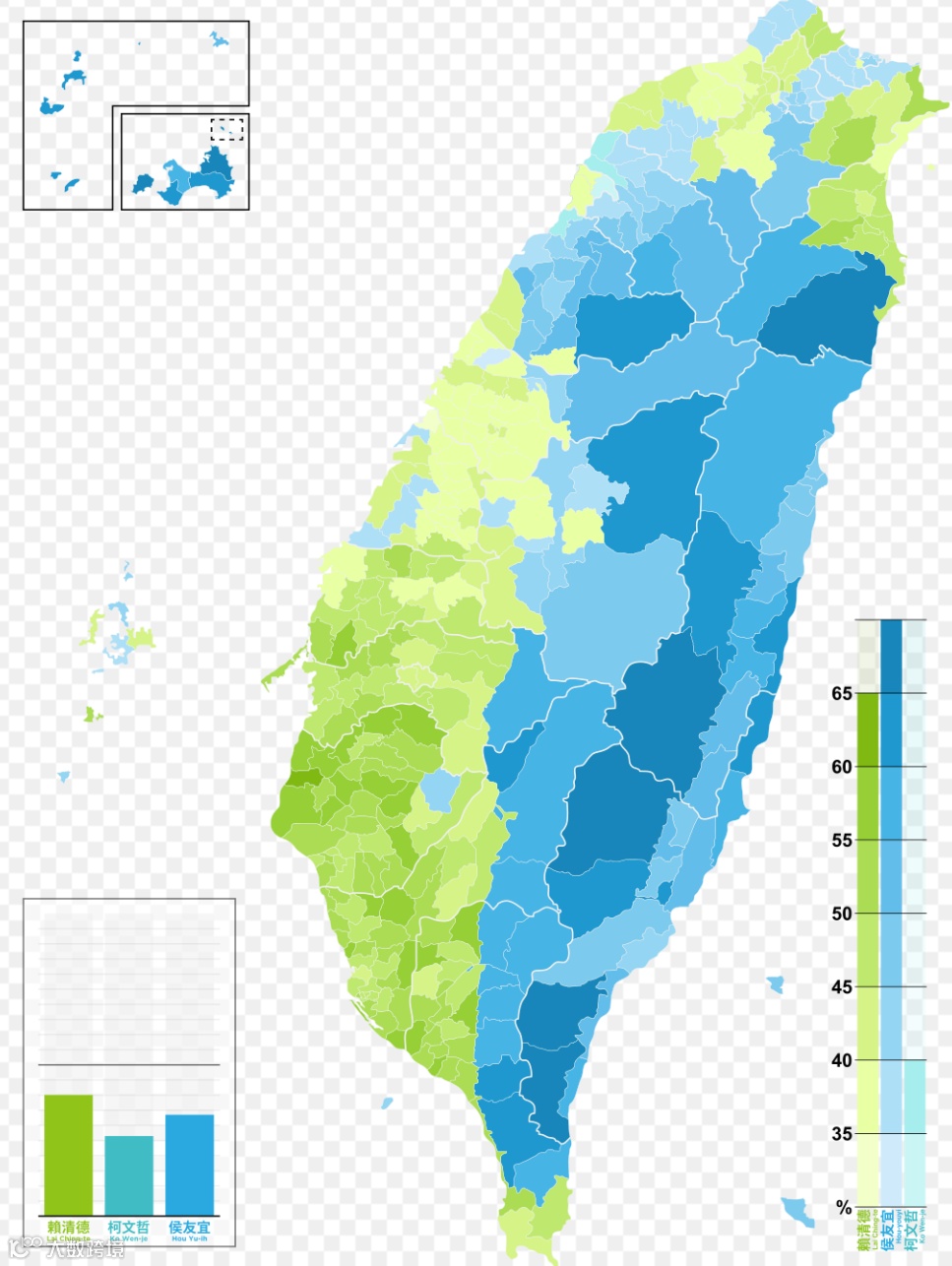 下图是选举地图。其中,绿色选区代表民进党赖清德胜出,蓝色选区代表国民党侯友宜胜出,青色选区代表民众党柯文哲胜出。颜色越深表示支持率越高。